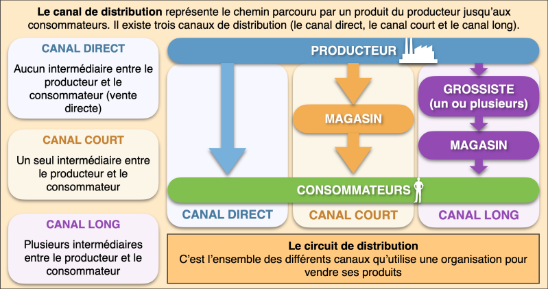Le canal de distribution représente le chemin parcouru par un produit du producteur jusqu’aux consommateurs. Il existe trois canaux de distribution (le canal direct, le canal court et le canal long).